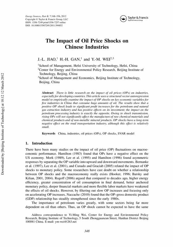 The Impact of Oil Price Shocks on Chinese Industries, J.-L. Jiao,H.-H. Gan,Y.-M. Wei,2012.