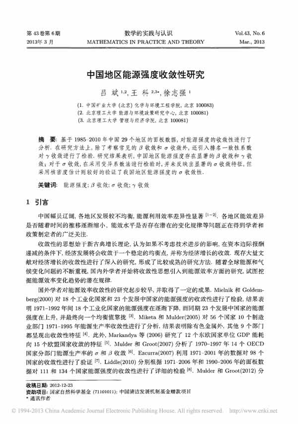 中国地区能源强度收敛性研究. 吕斌, 王科, 徐志强. 2013.