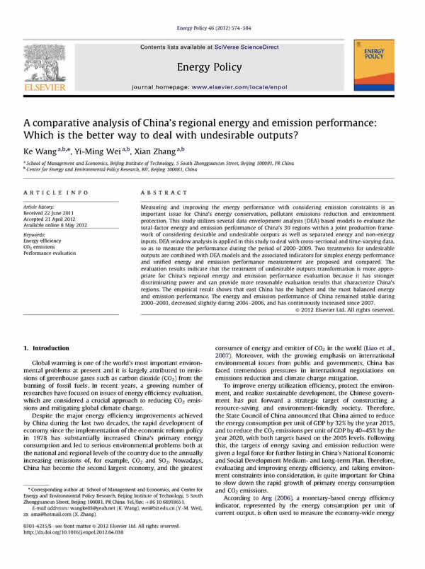 A comparativeanalysisofChina’sregional energy andemission performance:Which is the better way to deal witundesirabloutputs? K.Wang, Y.-M. Wei,X.Zhang.2012.