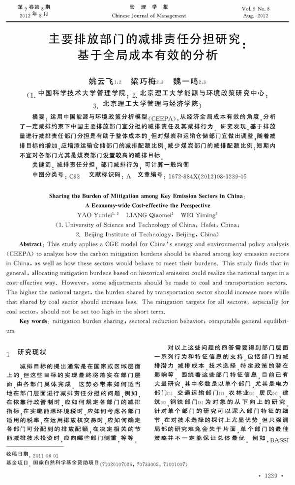 主要排放部门的减排责任分担研究:基于全局成本有效的分析.姚云飞,梁巧梅,魏一鸣.2012.