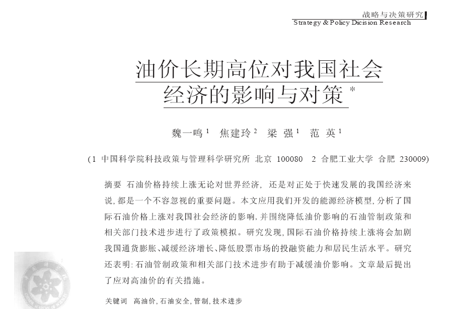 Impacts of High Oil Price on China’s Social-economy and its Countermeasures.Y.-M Wei,J.-L Jiao,Q.Liang,Y.Fan,2008.