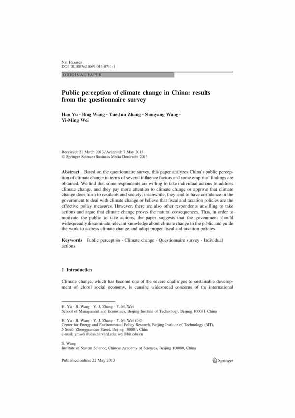 Public perception of climate change in China: results from the questionnaire survey. H. Yu, B. Wang, Y.J. Zhang, Y.-M. Wei, S.Y. Wang. 2013.