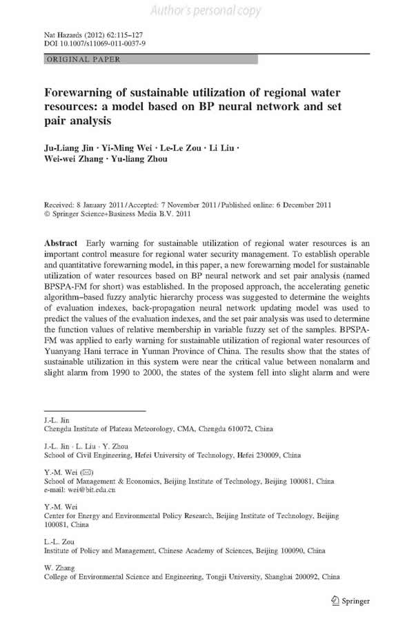 Forewarning of sustainable utilization of regional water resources, J.-L.Jin, Y.-M. Wei, L.-L.Zou et al., 2012.