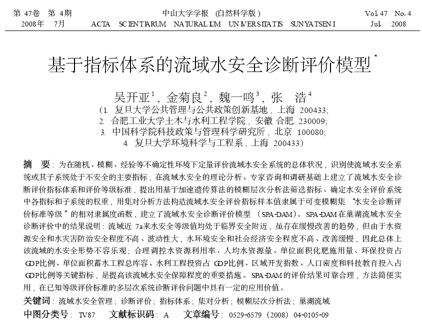 Diagnosis Assessment Model of Watershed Water Security Based on Index System, K.-Y Wu,J.-L Jin,Y.-M Wei,H.Zhang,2008.